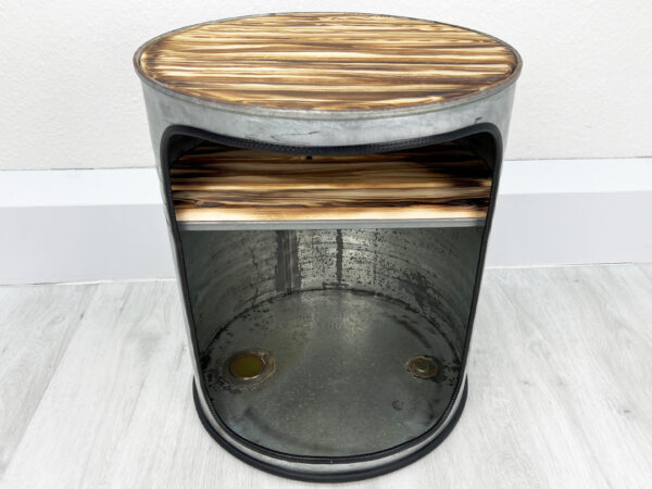 Die Kanten des Ausschnittes aus dem Ölfass sind mit einem schwarzen Kantenschutz versehen. Dieses Kunststoffband mit Metallkern bringt Sicherheit und eine weitere optische Aufwertung. Die Holzflächen aus Einwegpalettenholz wurden sorgfältig zugeschnitten, geschliffen und leicht geflammt, um die Holzstruktur markanter darzustellen. Danach wurden die Flächen mit Klarlack lackiert. Die Zinkoberfläche des Ölfassmöbel wurde innen wie außen leicht geschliffen und versiegelt.